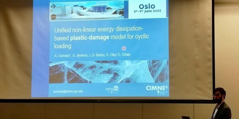 Sergio Jiménez, PhD student at CIMNE, has presented the work titled “Plastic-damage model for cyclic loading: phenomenological rule of mixtures approach”, introducing a new coupled plastic damage model developed which is especially formulated in for the case where transitions need to be made from the high cycle fatigue domain to low cycle fatigue or the other way around. The model is versatile enough to be reduced, if necessary, to exclusively a degradation process or to exclusively a plasticity process.